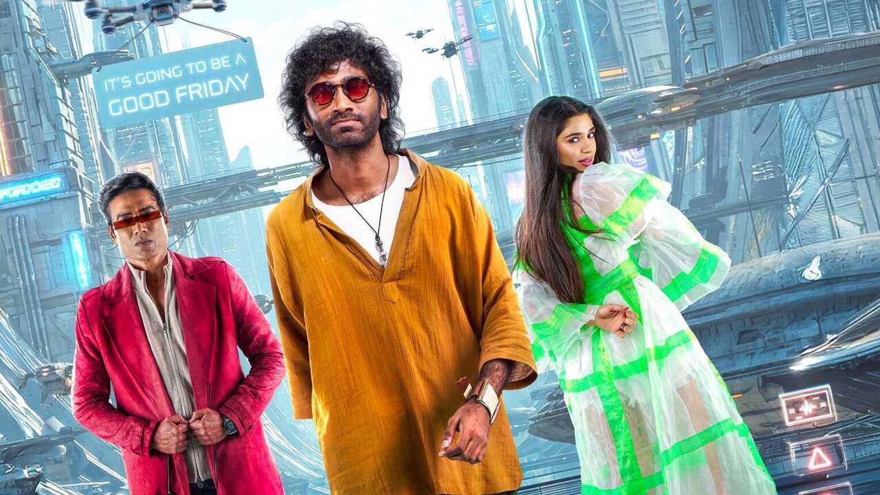 The only area where Shivan's efforts yield an approving smile is in the details that lend this future some credibility. The words "Fall Detected" appear on phones when they are dropped on the ground. Users of the titular dating app wear a ring that, depending on the way two people hold hands, declares them "connected" or "committed." There is a prison-like place where people are sent for committing cybercrimes like selling dubious products online, and this place has a machine that processes prisoners' phones and ejects a card containing the phone's memory. There are other amusing touches, like sunglasses placed on the shoulders of Vibe Vassey (Pradeep Ranganathan) and a nameplate with the residents' online usernames engraved on it.